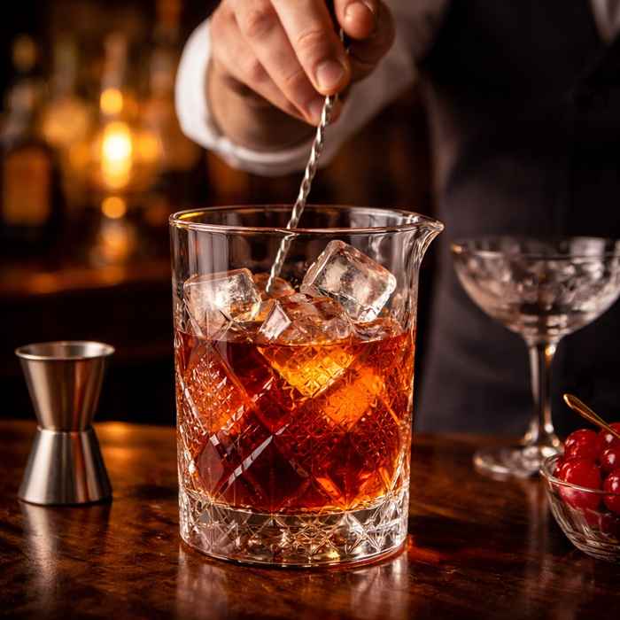 - 스티어링: 바 스푼으로 30~40회 부드럽고 일정하게 저어줍니다. 여러 재료가 완전히 섞이고 충분히 차가워질 때까지 저으세요.